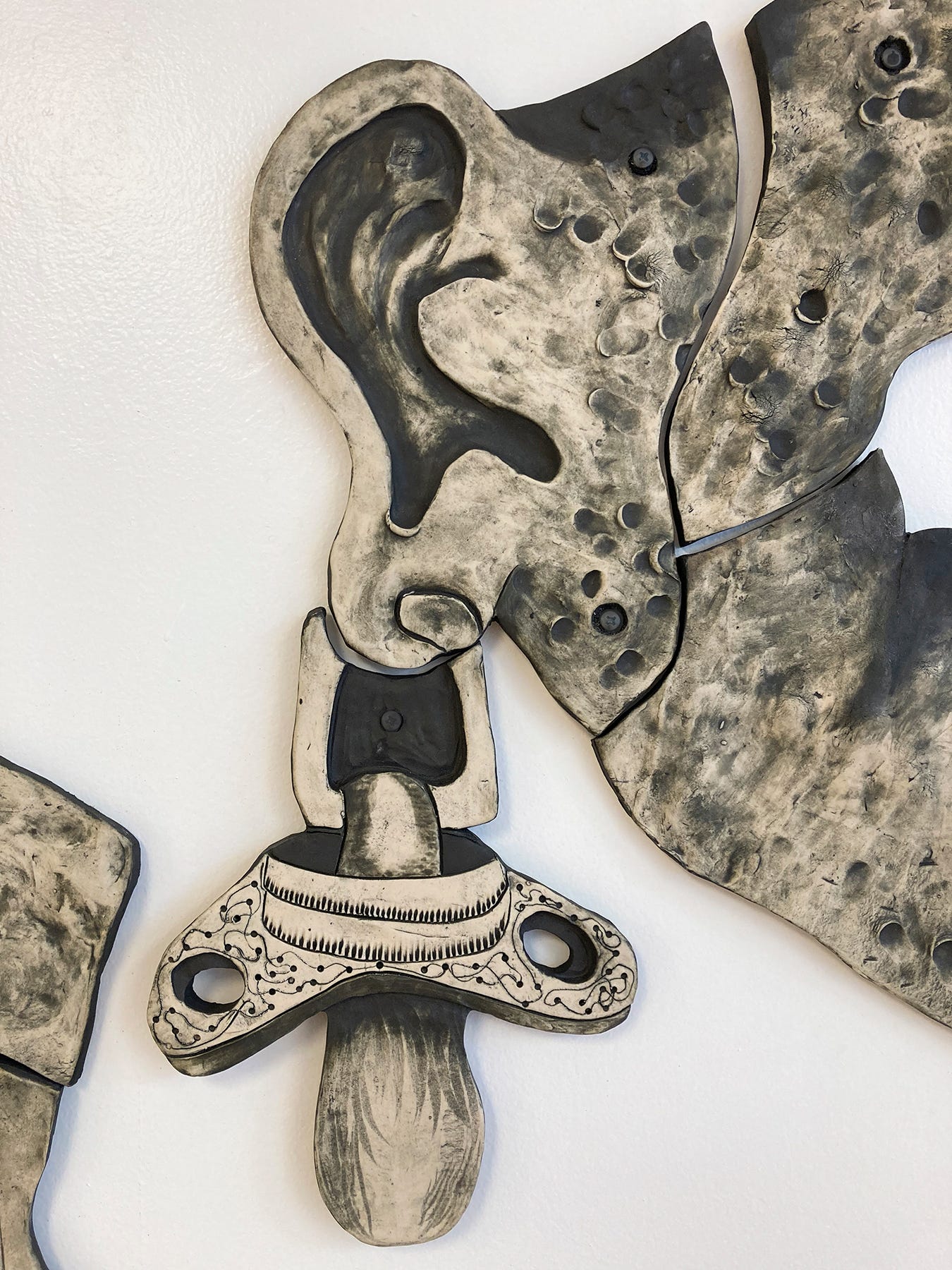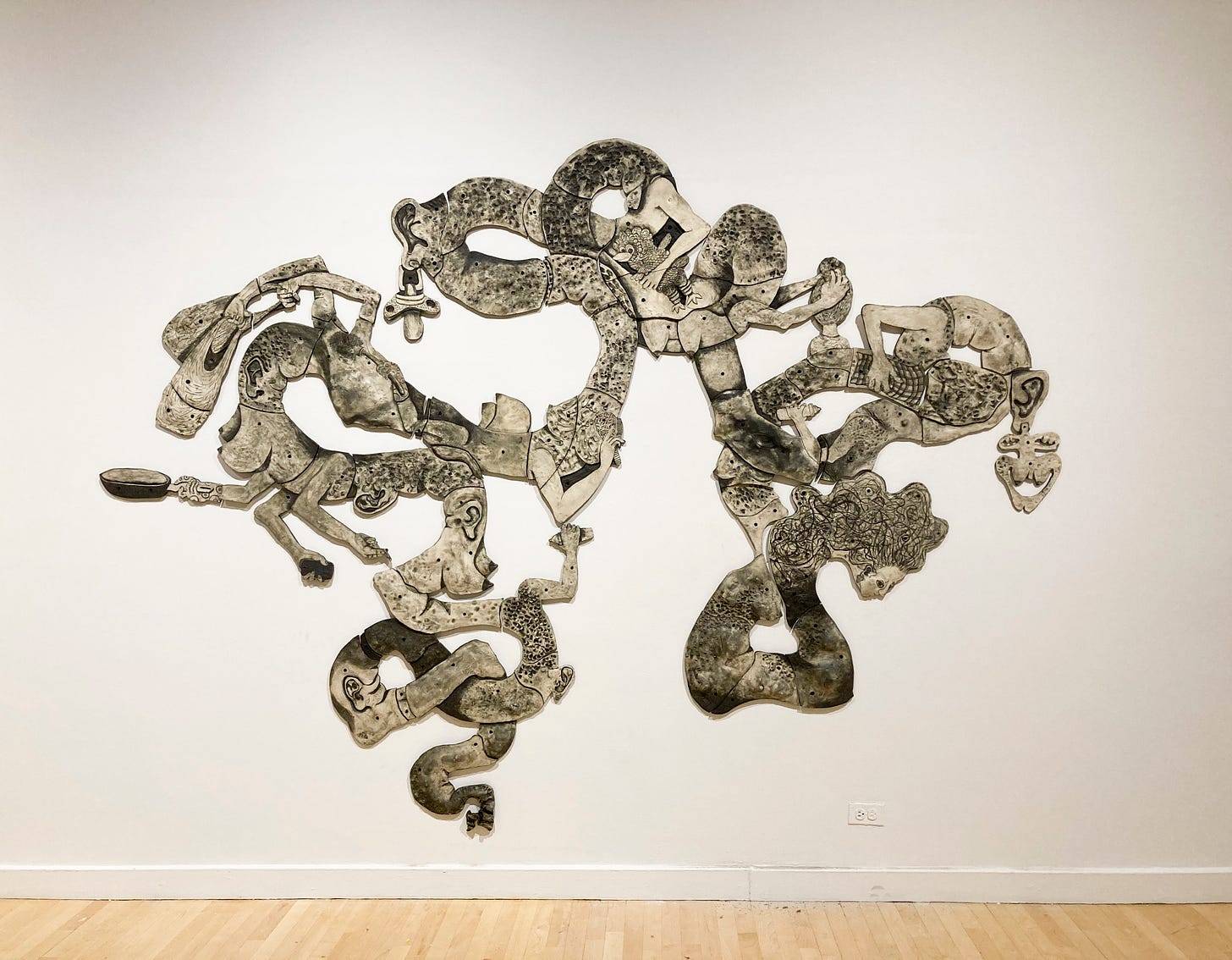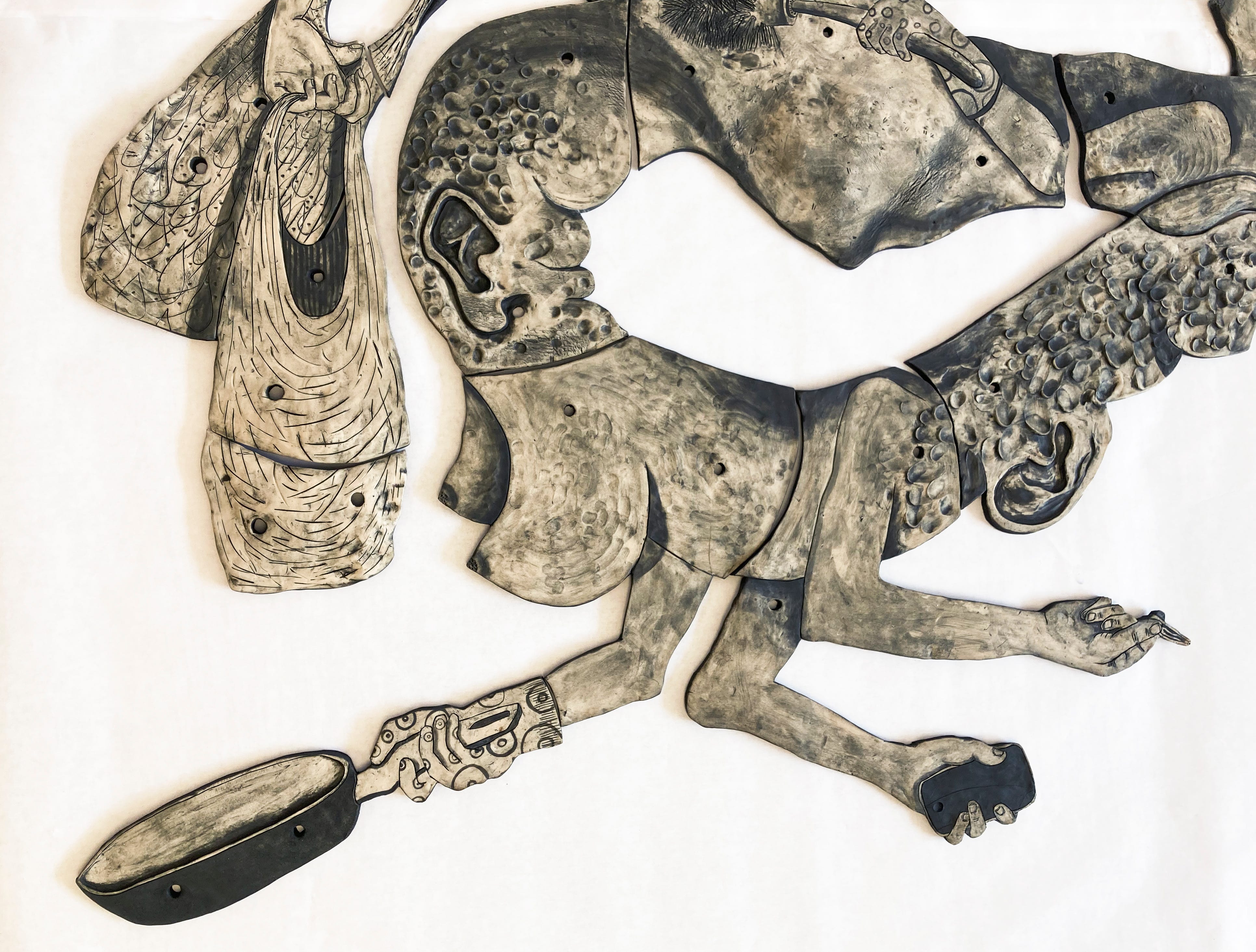She created a 10 feet long ceramic installation for the Bronx Museum called Mom which represents a multitasking mother of a young baby who looks like a mythological creature.