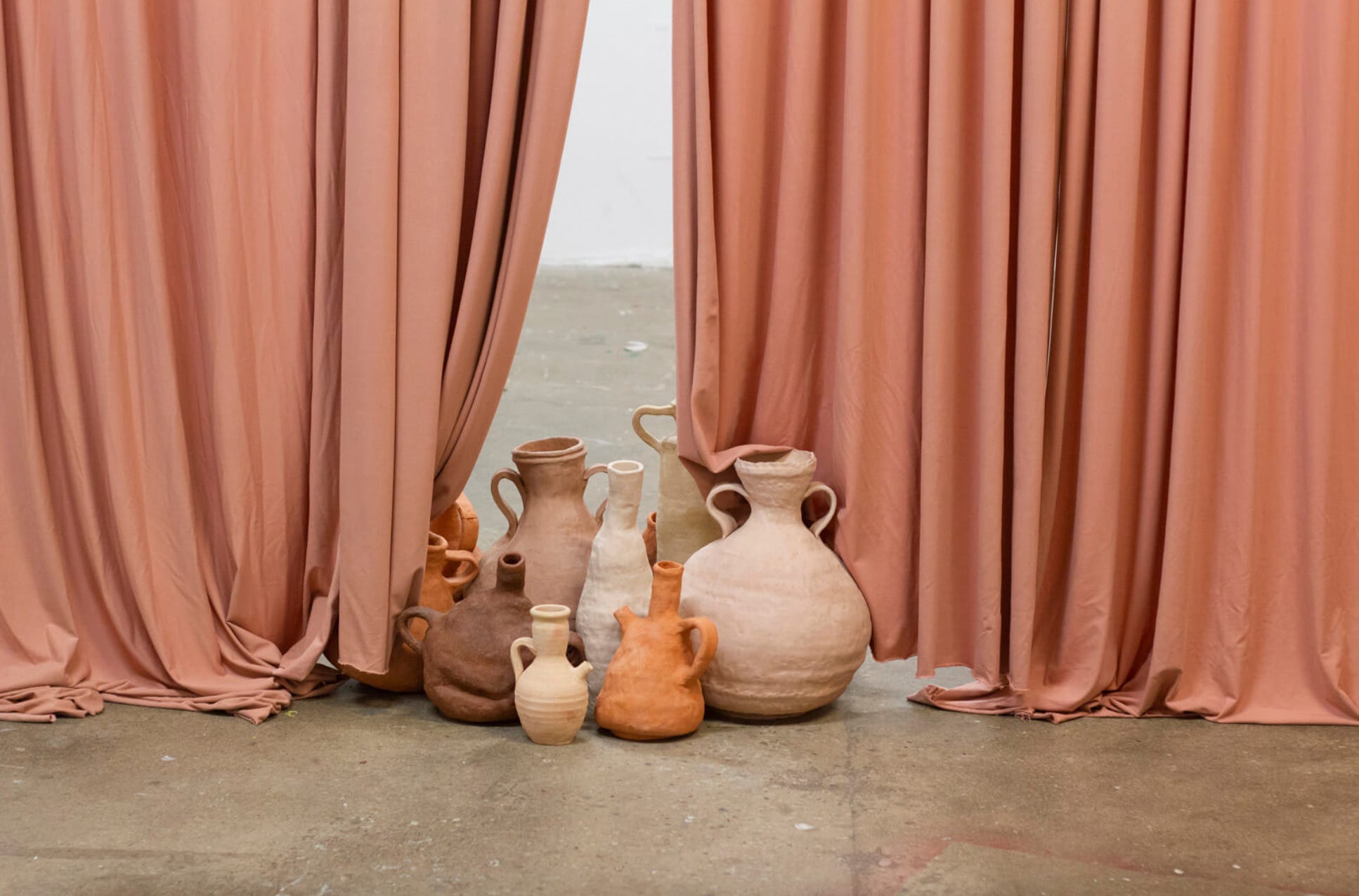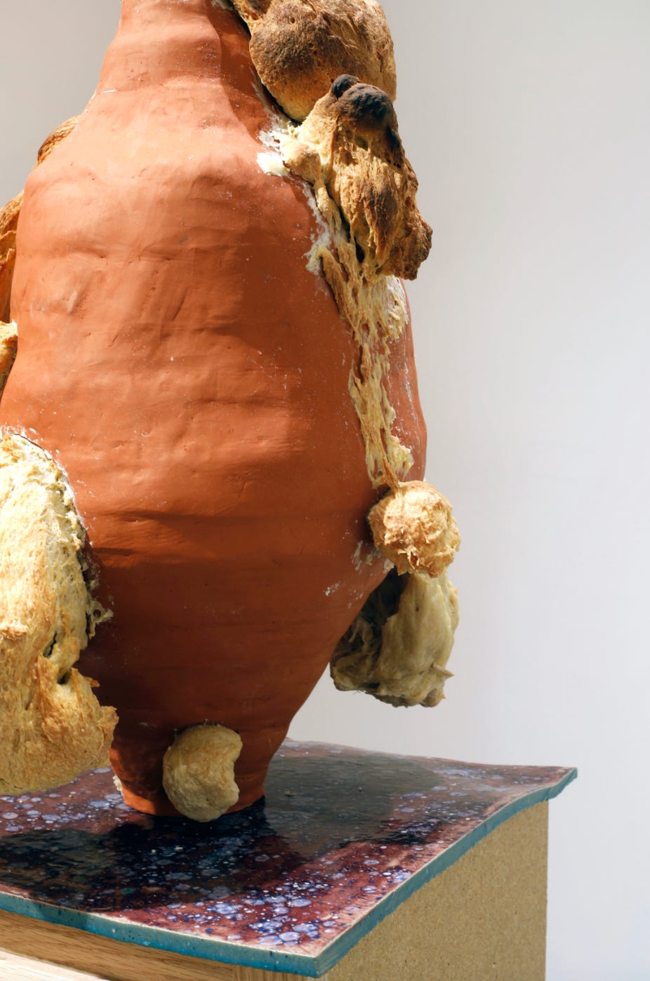 A series of her sculptures is based on the fact kneeding bread and clay are some of the most ancestral actions and movements. Both are very similar and very different at the same time: When fired, bread expands whereas clay shrinks. She combined both materials to make stunning amphoras. One was showed at The Invisible Dog Art Center last year as well as NADA Foreland in 2022.